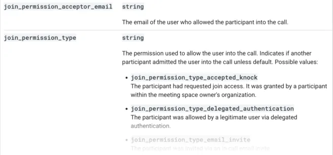 O registro de eventos de auditoria do Google Meet para endpoints agora também incluirá o tipo de permissão usada para conceder acesso para participar de uma reunião.