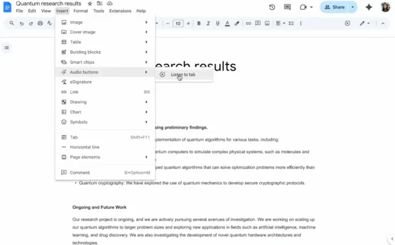 Para aqueles que preferem ouvir o conteúdo do documento, temos o prazer de apresentar a capacidade de criar versões em áudio dos seus documentos usando o Gemini no Google Docs.