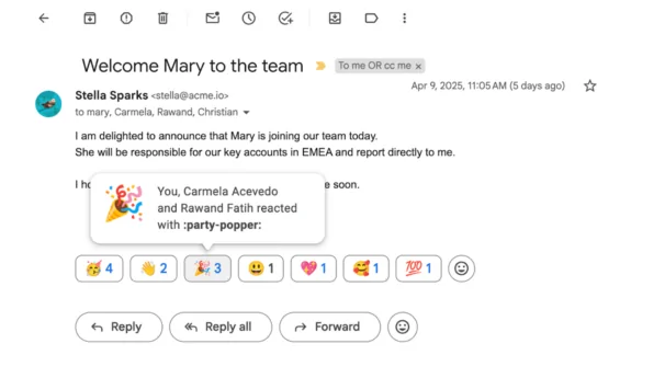 Em 2025, introduzimos a possibilidade de reagir a emails no Gmail com emojis. Esta funcionalidade permite que os utilizadores respondam rapidamente para confirmar a receção de um email de uma forma divertida, informal e mais autêntica. Embora inicialmente disponibilizada como uma funcionalidade opcional para acesso antecipado dos clientes, a partir de 9 de fevereiro de 2026, as reações com emojis no Gmail serão ativadas por predefinição.