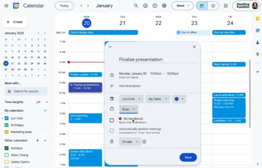 Agora, os usuários podem bloquear facilmente horários em seus calendários para trabalhar em tarefas específicas. No seu calendário, selecione um horário vazio > clique em “Tarefa”. A partir daí, você pode adicionar a tarefa e a descrição relevantes, além de personalizar detalhes como visibilidade e configurações de “Não perturbe”. Agora você pode trabalhar em uma tarefa específica sem interrupções. Você também verá a tarefa na sua lista de tarefas e receberá lembretes até que ela seja concluída.